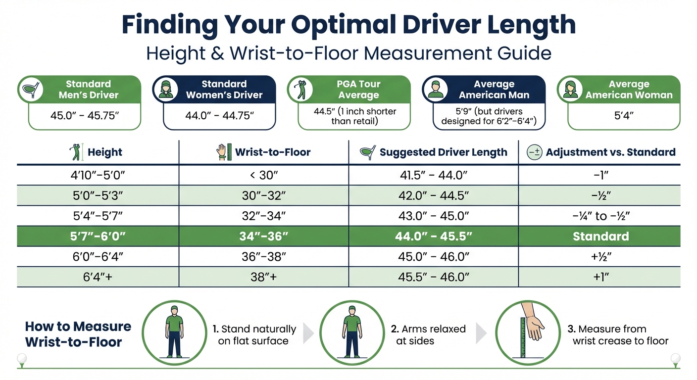 | Height | Wrist-to-Floor | Suggested Driver Length | Adjustment vs. Standard |